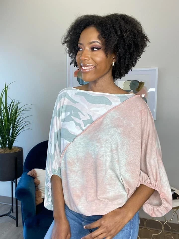 Features: Camo Print Mix, Oversized, Batwing, Round Neck, Elastic Bottom