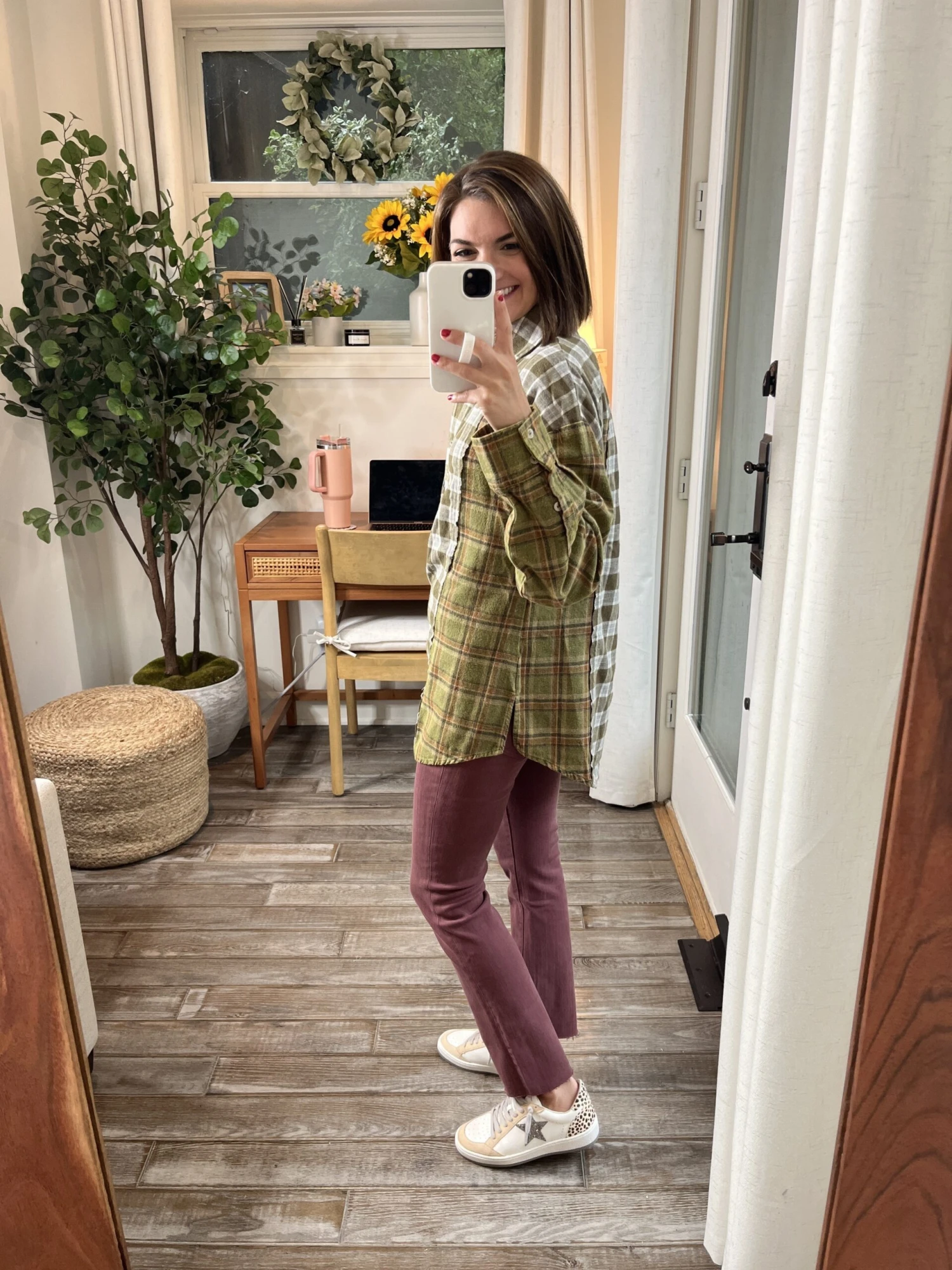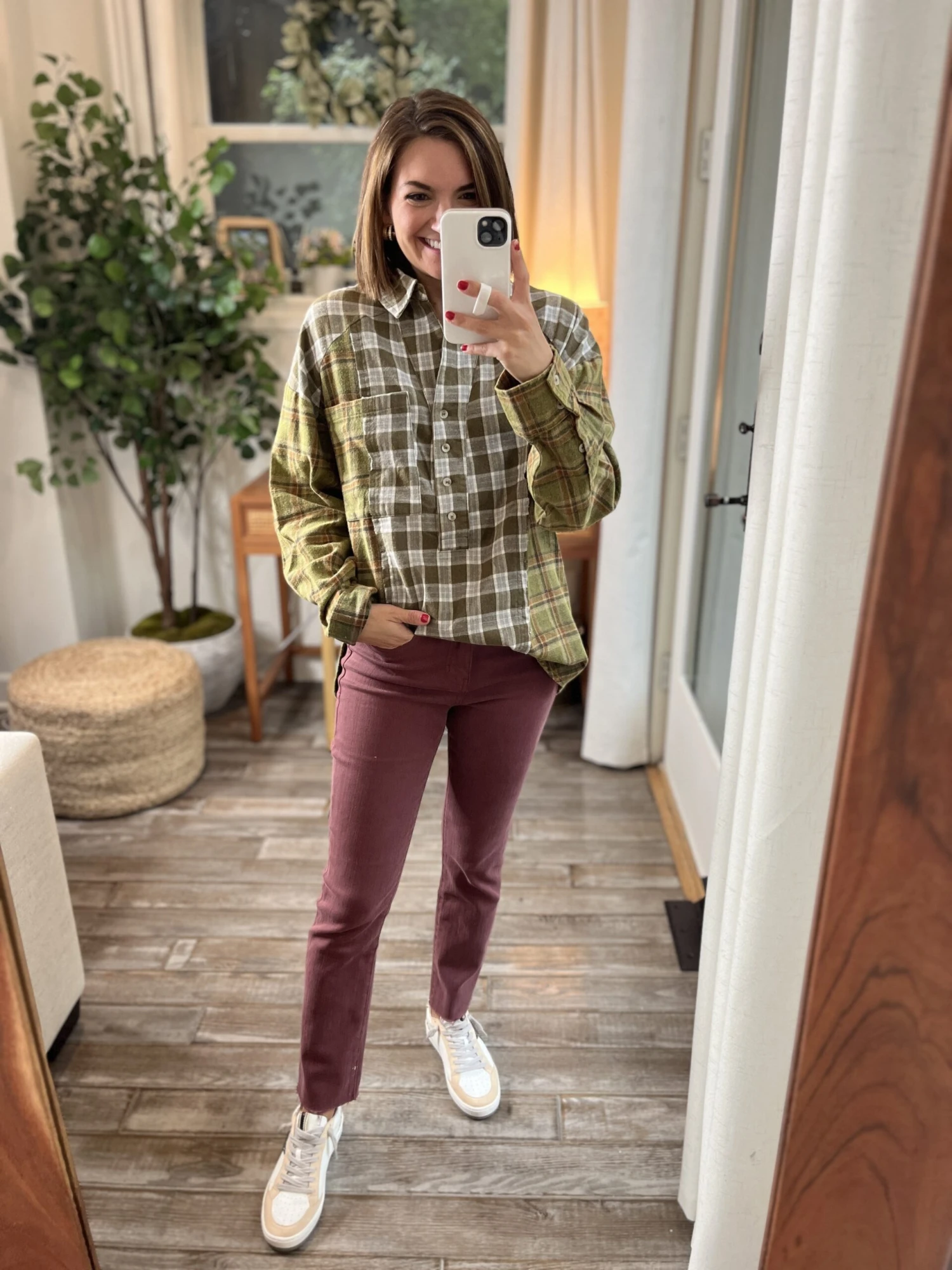Features: color block plaid print, collared, summary down, long sleeve, chest pocket