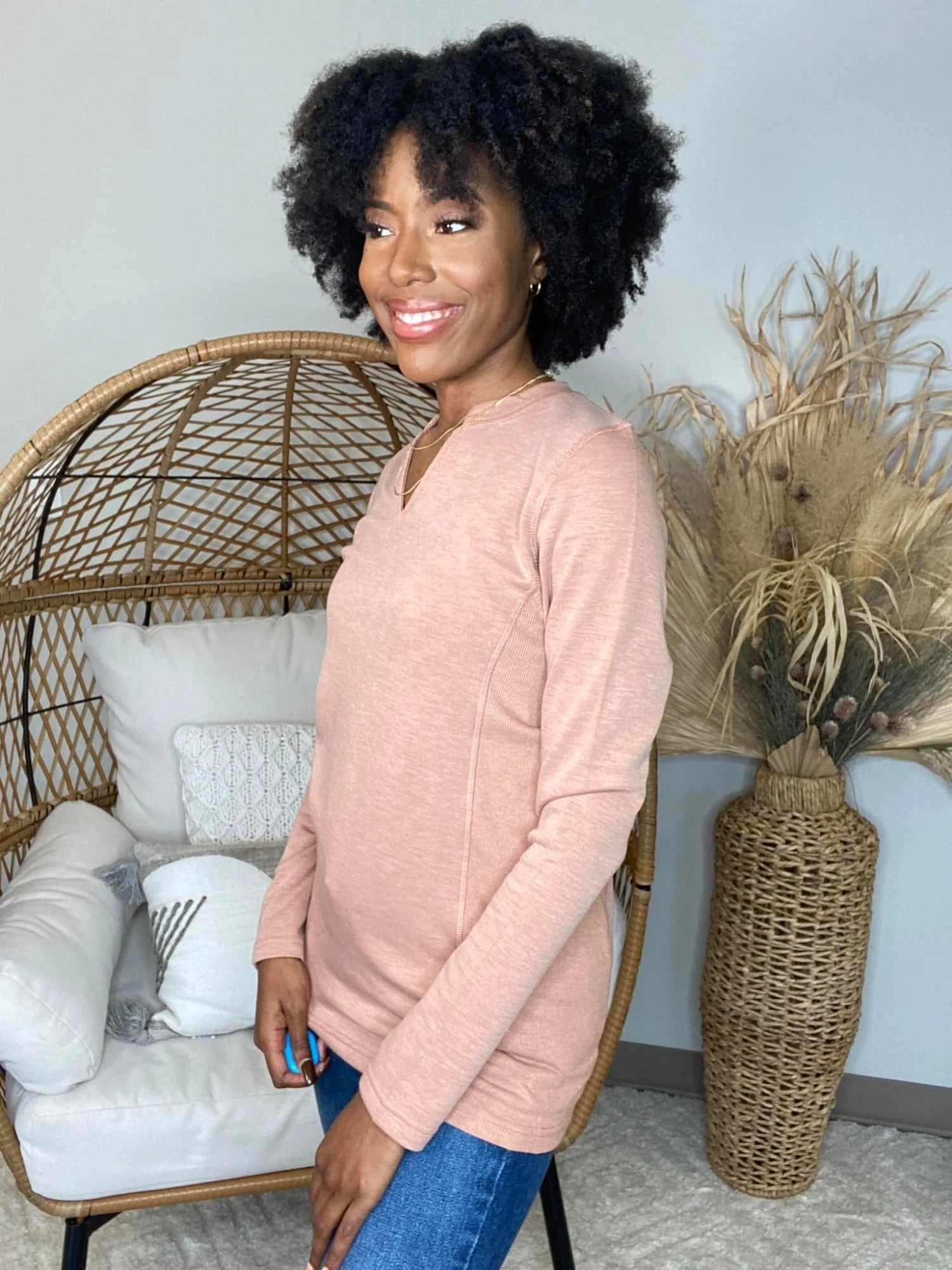 Features: solid print, long sleeve, paneled w/ raw accents, v neck