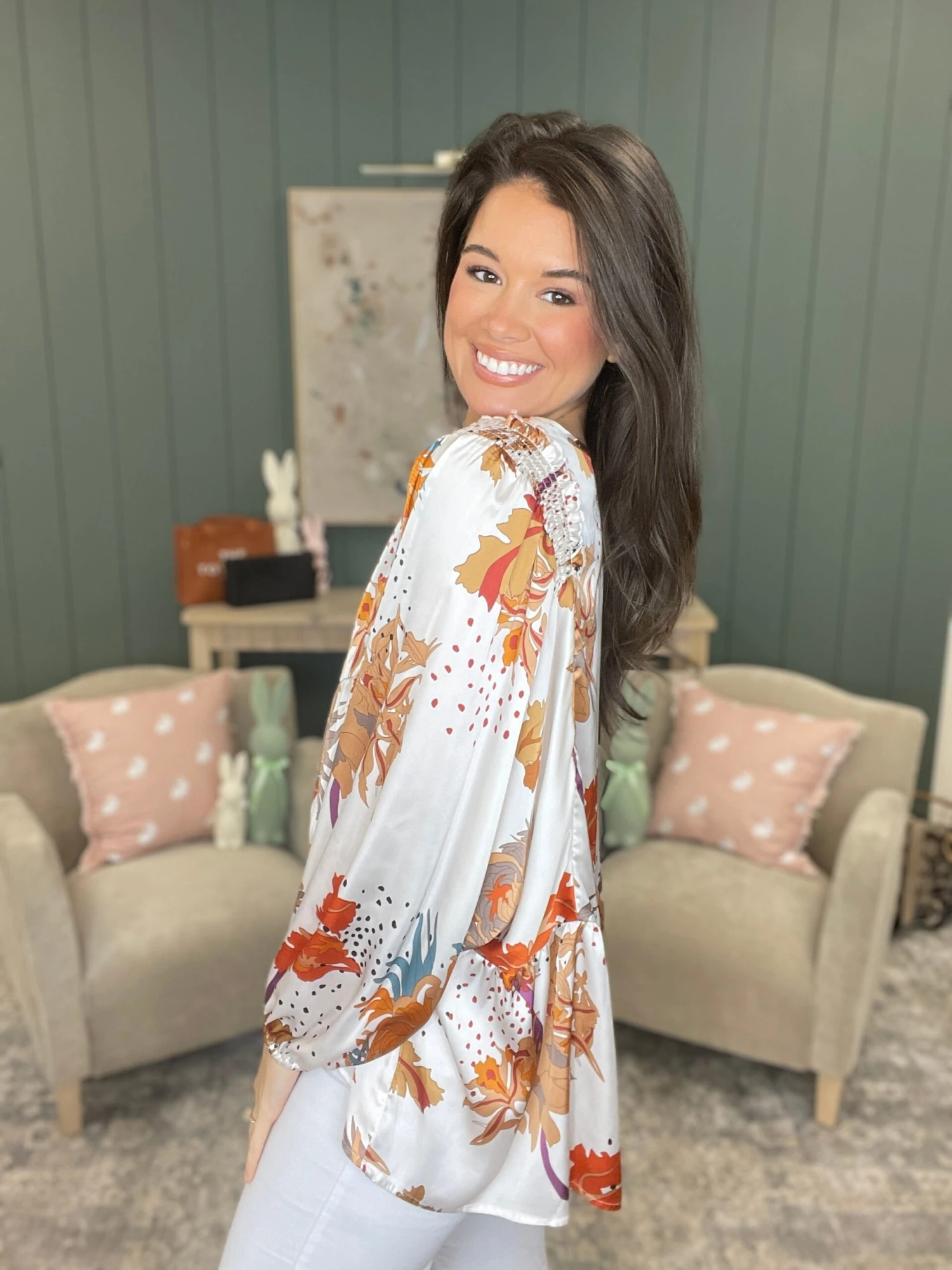 Features: V-Neck, Long Sleeves, Balloon Sleeves, Floral Print