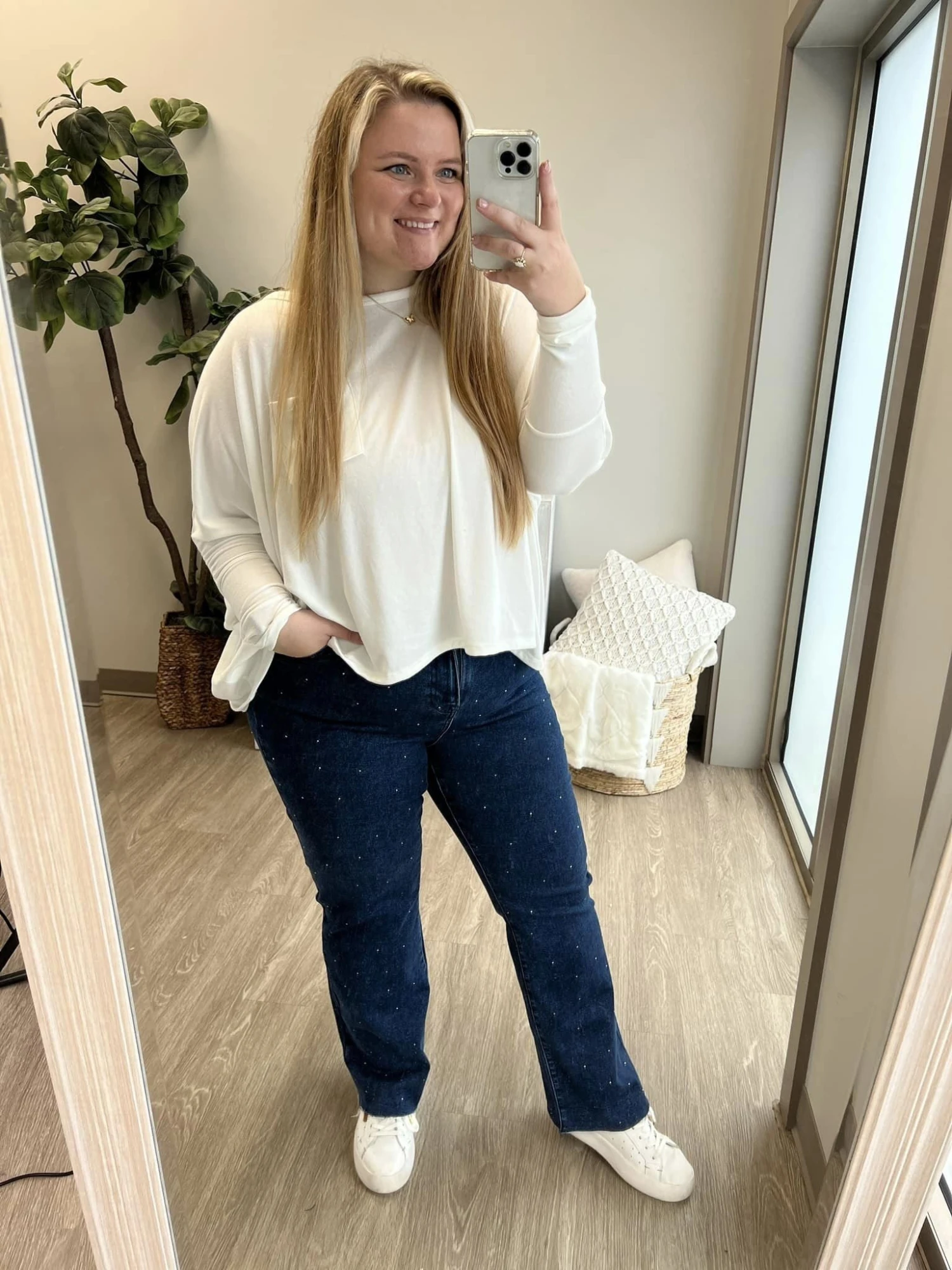 Ummm rhinestones?? Yes please! The “Jump In Line Jeans” are for all my girls who love a little sparkle! These high rise jeans are just what you need! They even have pockets! The full package!
