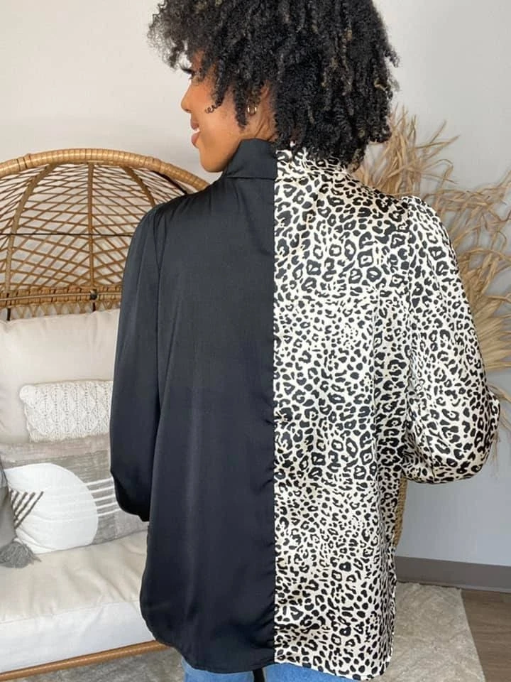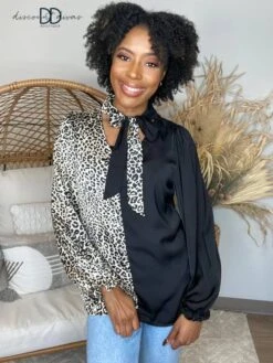Features: colorblock w/ leopard print, long puff sleeves, ribbon neck tie, v neck