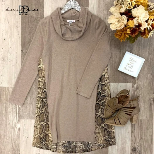 Features: Tunic length, long sleeve, cow neck, snack print back detail