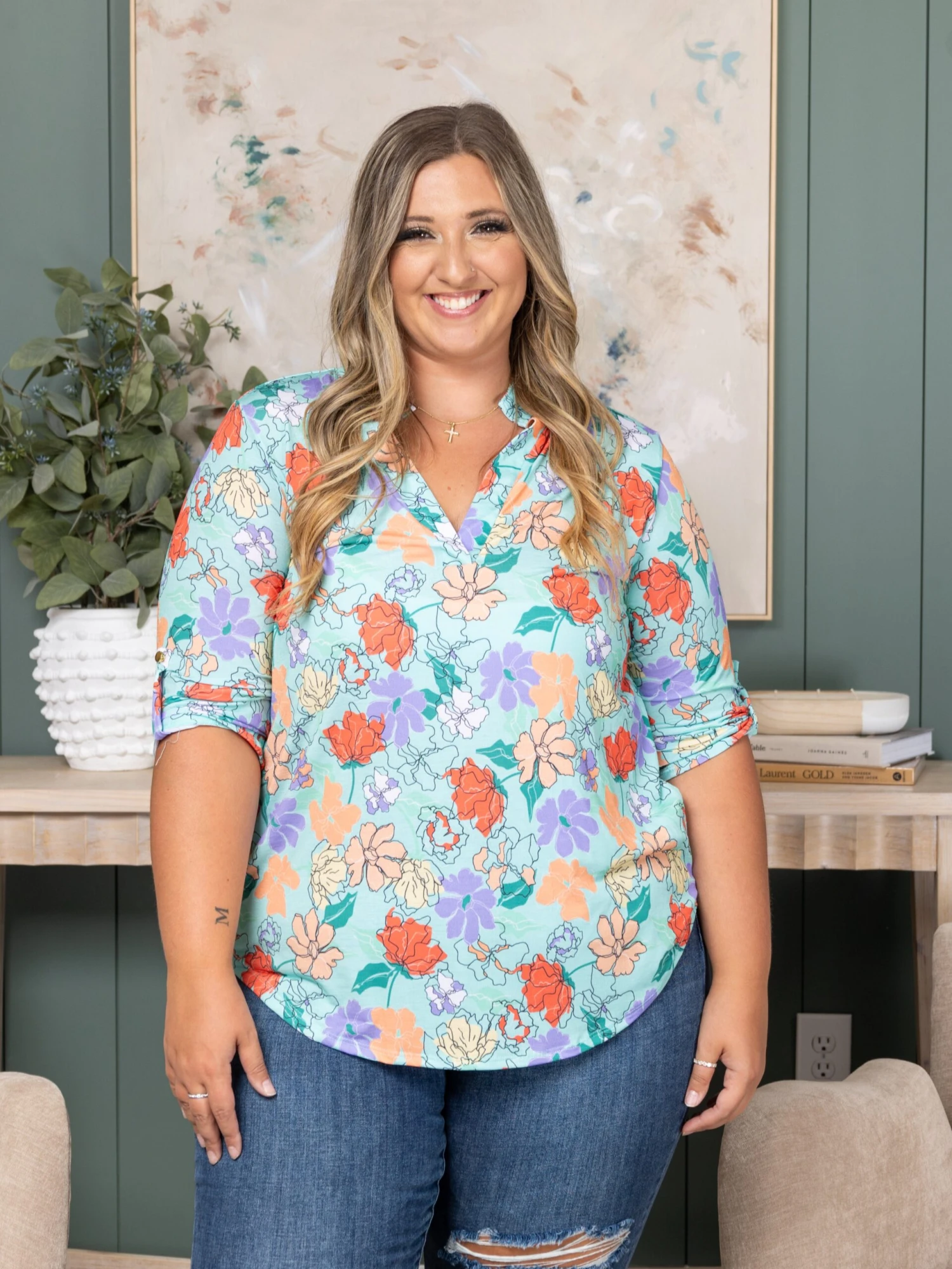 Features: Roll Up Button Sleeve Floral Hi Low Top