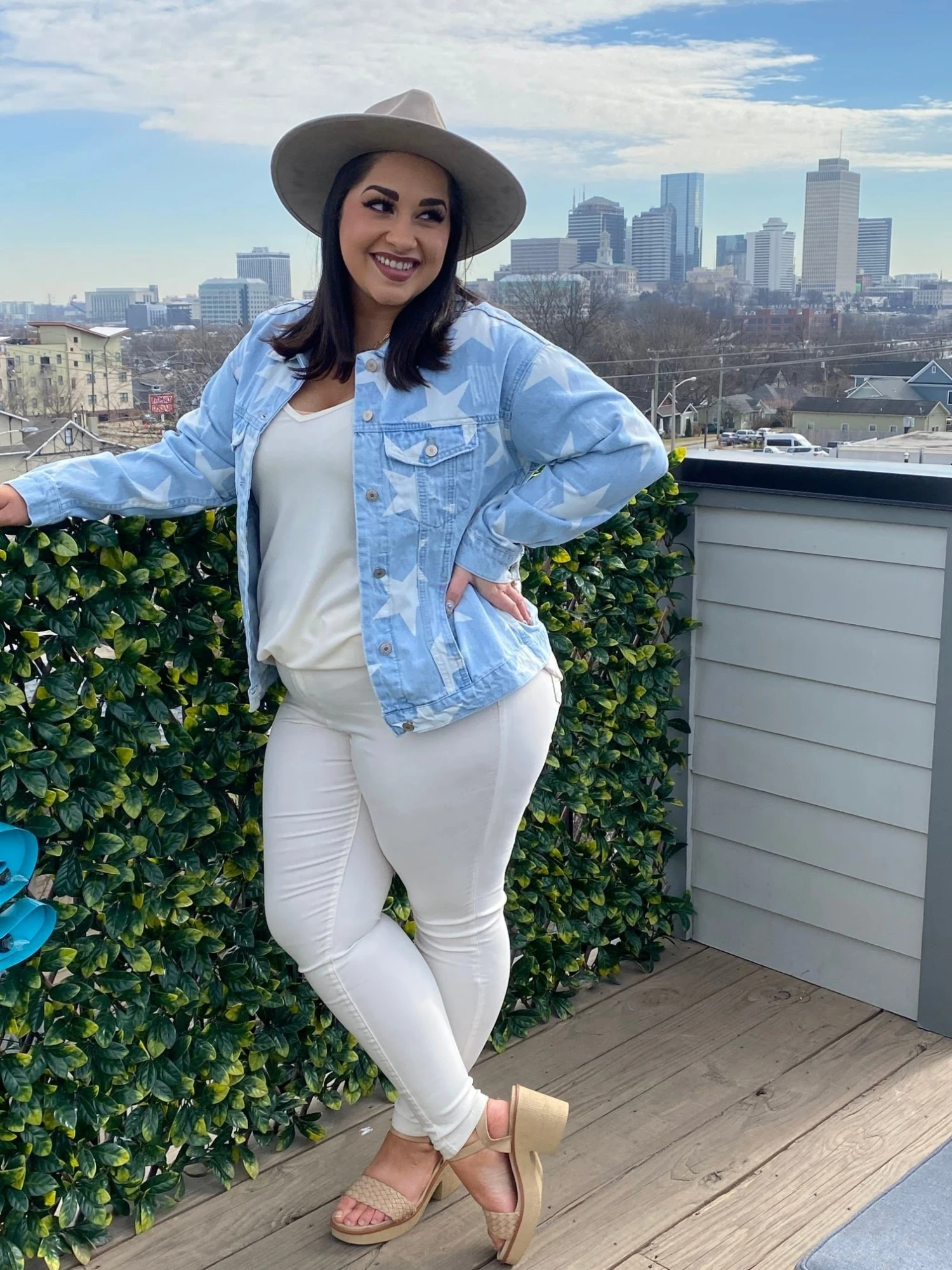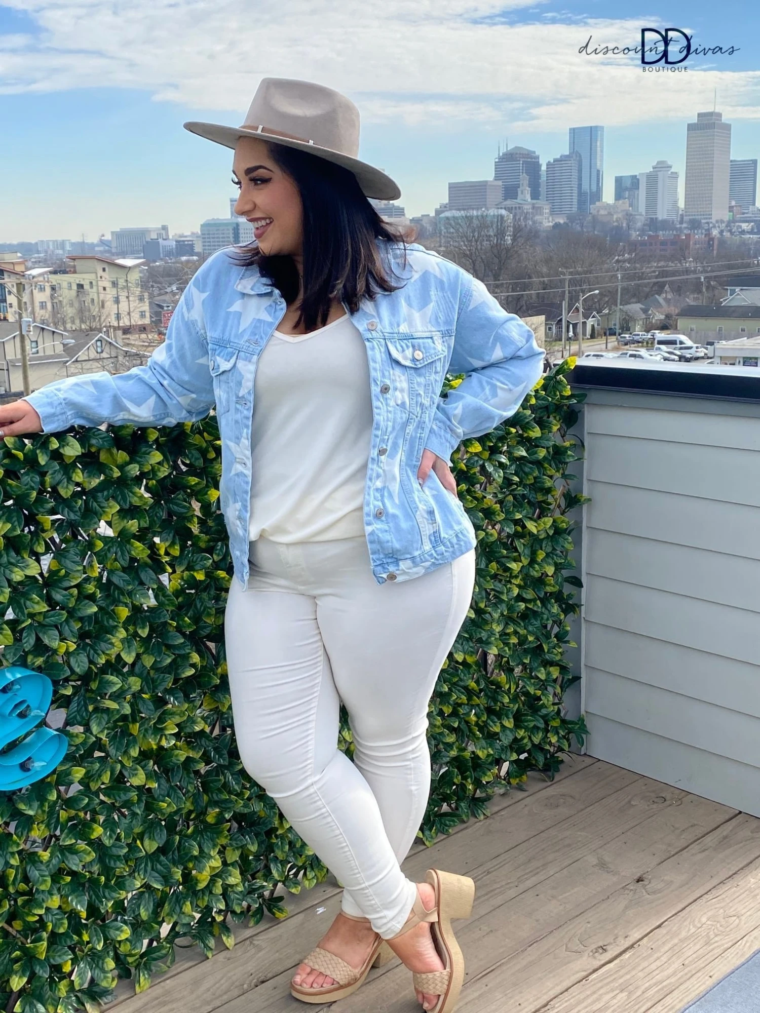Features: washed denim, star print, summary down, collared